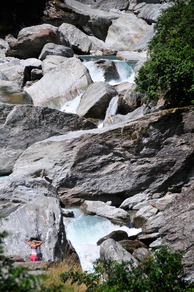 哈斯特河原本也是條冰河,但目前只能看到冰河的遺跡,而這裡的河水湍急,加上冰河切割後的地貌,景色非常的壯觀。我看到有人在河裡外拍,看著那激流不斷沖刷,對於來這裡外拍的人像的決定,真的是相當的佩服。我注意到有一對情侶,往河道上方前進,感覺似乎想找個安全可以玩水的地方。