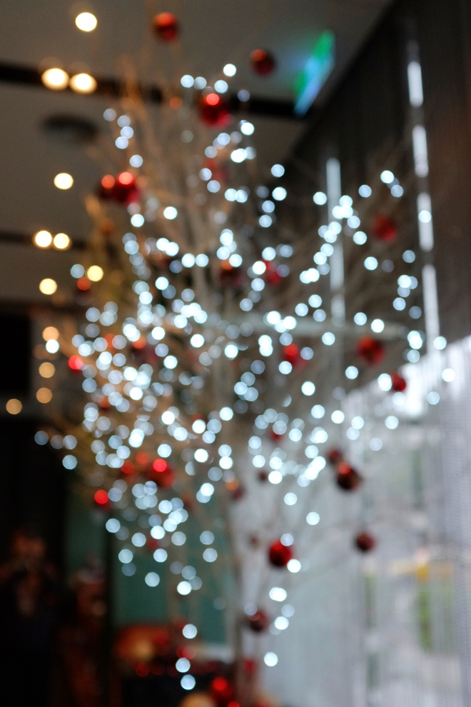 ◄ 利用大光圈淺景深的特性,再搭配失焦的模式,在某些場景上可以呈現出另一種抽象的意境。我在全國大飯店的咖啡館喝下午茶時,注意到咖啡廳裡有株聖誕樹的造景。上面的燈飾非常漂亮,於是我利用失焦與淺景深搭配,用燈飾的光點形成聖誕樹的輪廓。利用抽象的表現法,來呈現一種情境與氛圍。Fujifilm FinePix X100