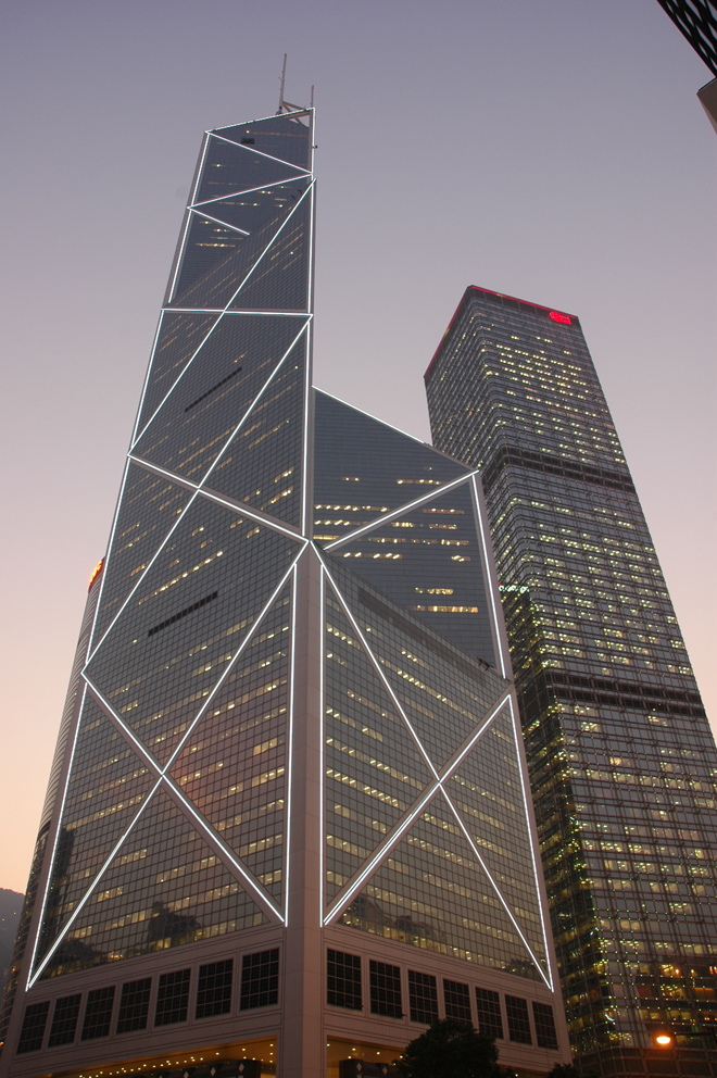 ◄ 黃昏時刻,建築物外牆的燈光亮起,這有如劍光波紋的中銀大廈,就適合透過垂直構圖的方式來表現。多數建築物的場景,都適合透過垂直構圖的方式來表現。Nikon D70 & AF-S 18-70mm Nikkor f/3.5-4.5G ED