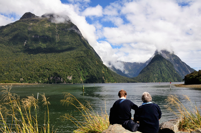 ► 等待船班(Milford Sound Red Boat Cruises)的这一段时间里,我走到旁边堤岸的最远处,静静的享受峡湾宁静的景观。由于前一天下过大雨,所以前往堤岸顶端这短短的一百公尺,都积满了水。我小心翼翼的跨过大大小小的水洼,走到尽头时才发现已经有人默默的坐在这边,体验当下的大自然美景了。这一趟到纽西兰的行程,住宿的安排比2006年的纽西兰行程更好,不过我发现可能是住宿的等级提高了一些,因此沿路遇到的客房旅伴都是退休的外国友人,每一组来这里度假都是一个月,相较之下我这短短的半个月实在就不够完美了。