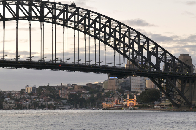 ◄ 雪梨的海港大桥最为人所知的,应该就是每年跨年的烟火秀了。这座由钢骨结构所组成的拱形桥梁,远看是雪梨著名的景点,若是搭乘渡轮从下方经过,亦或是开车从桥上走过,都不禁让人赞叹它的浩大工程,近距离观看尤其能让人感到它的宏伟壮观。在雪梨的时候,海港大桥与歌剧院可说是百拍不厌的主题,不同的角度、不同的时段,不一样的气候天色,都带给我们截然不同的感受。我对于构图的想法,就如同以前练习写字一般,其中书法的练习很有参考价值。一开始我们都会从基础的笔划学起,接着进入临摹,最终发展成自己的文字风格。而其实最重要的是耐性,以及美感的掌握。熟悉构图的技巧,也是类似的模式。最后我们的拍摄,终将成形变成我们个人风格的展现。