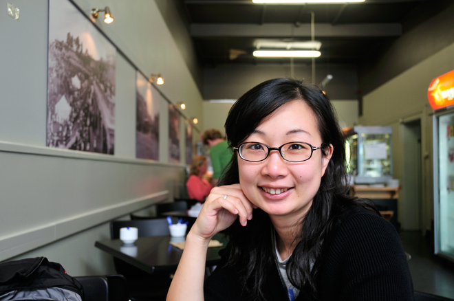 Lydia坐在面向街道的位子,这天的气候很好,外面的阳光可以照进店内,从我的位子拍摄刚好是顺光的状态,利用户外的采光搭配店内原有的光源,让人物的肤色显得相当自然。顺光的角度是摄影上较好掌握的一个方向。Nikon D300 & AF-S VR Zoom-Nikkor 18-200mm f/3.5-5.6 G ED DX