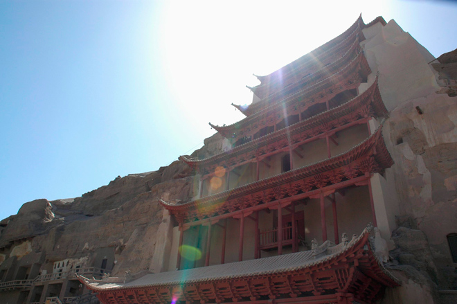 ◄ 莫高窟位于肃省敦煌市东南方的鸣沙山崖壁上,它与山西云岗石窟、河南龙门石窟并称为中国「三大石窟」。从公元366年开始有了第一个佛窟之后,便陆续出现了其他石窟,一直到元朝才结束,目前现存的一共有735个石窟。1990年时,在这边无意间发现了一个密室(目前编号17),里面有四世纪到十四世纪的文物,而这些发现到后来衍生成为「敦煌学」。