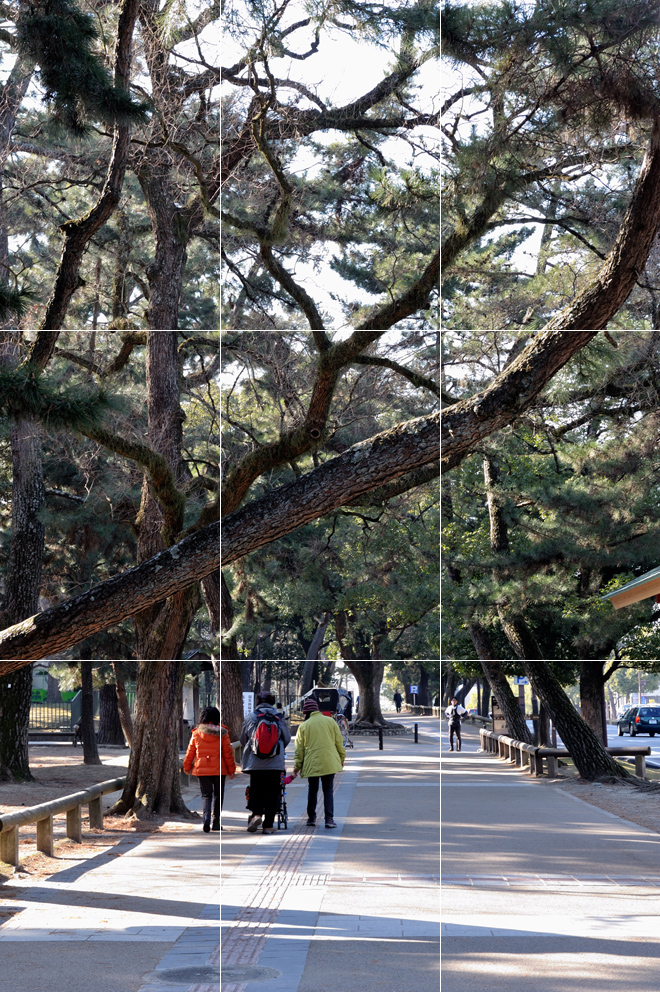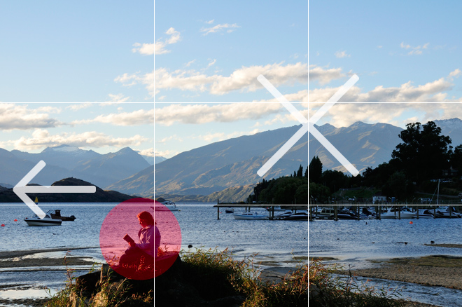 我在使用井字构图法时,初时会以四个点作为主体的摆放参考,但后来我较常使用的方式,是利用长与宽的三分之一区域,来进行构图的参考。透过区域的方式,可以让画面的组合更多元,而不会局限在四个点的位置上。