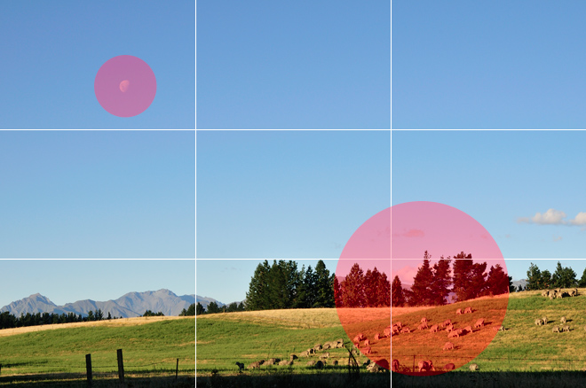 透过四个点,或是三分法则来构图,主要是要避免中心点构图,或是对称构图的盲点。通常将画面主体摆放在正中央,因为会过于无趣,没有延伸性,而导致观者观感疲劳,形成较没有张力的作品,而对称构图也有类似的问题。但并非中心构图或对称构图不好,而是要视主题应用的场合。而多数采用三分构图或井字构图,可以让画面具有和谐性跟美观性。