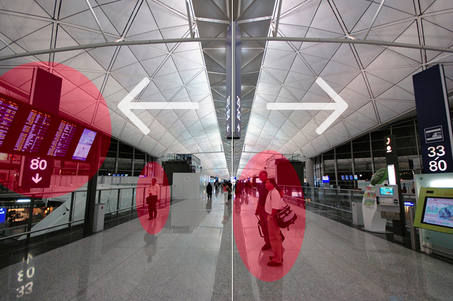 ► 在香港机场的廊道上,我也是采对称构图的方式来取景。画面中的旅客正在观看左方的航班时刻表,而其背景的廊道与整个空间式对称式的,只有人物并非对称。我习惯在对称构图的画面中,安排不对称的前景,藉以增加一些趣味性跟差异性,让画面不会太过单调。Nikon D70 & Sigma 10-20mm F4-5.6 EX DC HSM