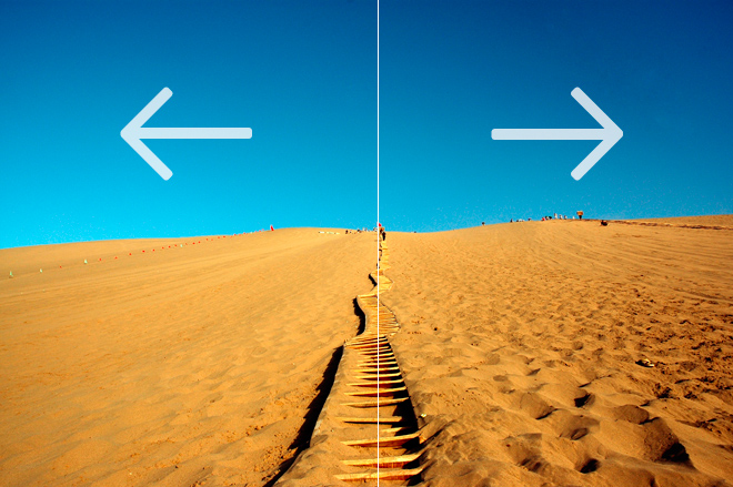 我是背着一大袋的相机包向上攀爬的,这条路虽不及蜀道险峻雄奇,但也颇有沙道之难,难于上青天之感。为了避免沙子跟包包接触到大量的沙子,每一步都得小心翼翼,深怕自己一不小心滑倒了,那可就直接滚到沙丘脚下了,连带的相机跟镜头大概也就毁了。向上攀爬的过程中,每隔五分钟我就会停下来喘口气,顺便观察一下周遭景色的差异。在向上望时,发现这个角度相当奇特,于是就拍下了这幅照片。这里也是采用对称构图的方式,利用中间的木格梯将画面分为左右两半,同时上方的蓝天跟下方的鸣沙山也自然的分成两半。这种对分的结构,本身虽然是对称构图的原则,但画面并非完全对称,因此可以让观者的眼光在画面上比对跟游移,产生多一些的互动。Nikon D70 & AF-S 18-70mm Nikkor f/3.5-4.5G ED